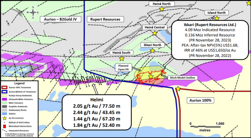 Aurion is a hybrid project generation company, meaning that they have both 100% owned and explored properties, plus projects that they vend to partners for exploration. In Helmi’s case, it’s a joint venture with B2Gold Corp. (BTG:NYSE; BTO:TSX; B2G:NSX).