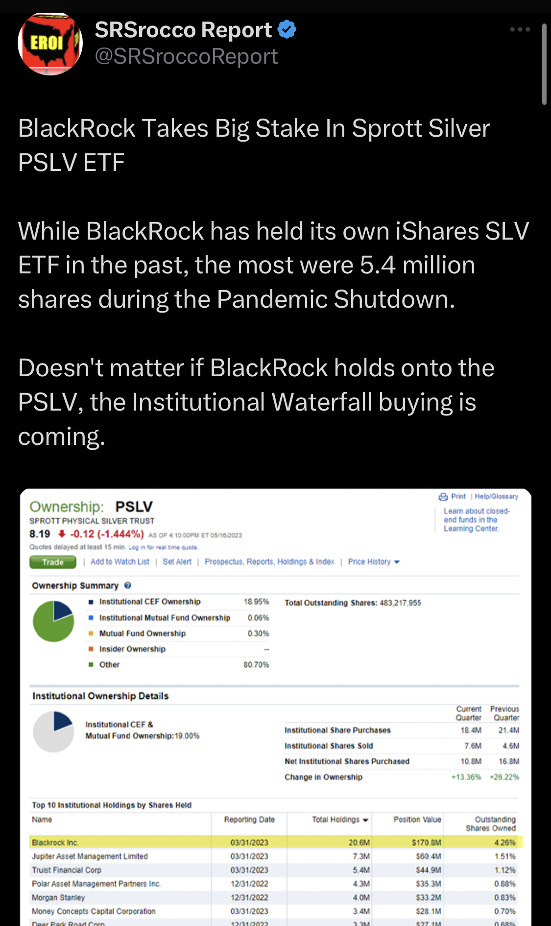 BlackRock Takes Big Stake In Sprott Silver PSLV ETF (20.6 million shares)