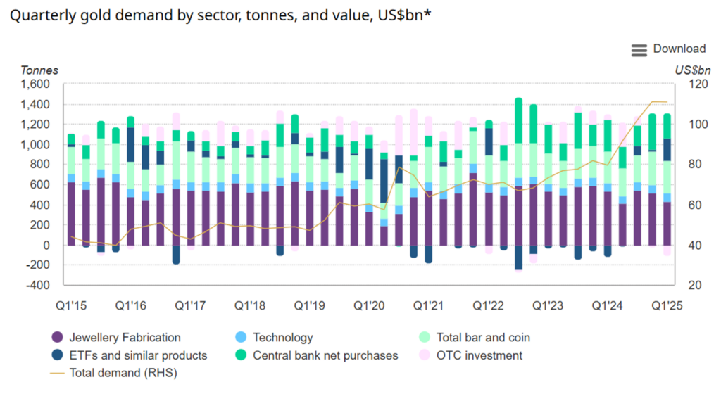 Central bank demand might have fallen by 33% quarter-on-quarter (QoQ), but Q4 2024 experienced an unprecedented rise in purchases. Q1 2025’s official purchases reached 243.7 tons, averaging roughly 81 tons per month. According to the WGC, this rate is “comfortably within the quarterly range of the last three years,” signaling strong momentum.