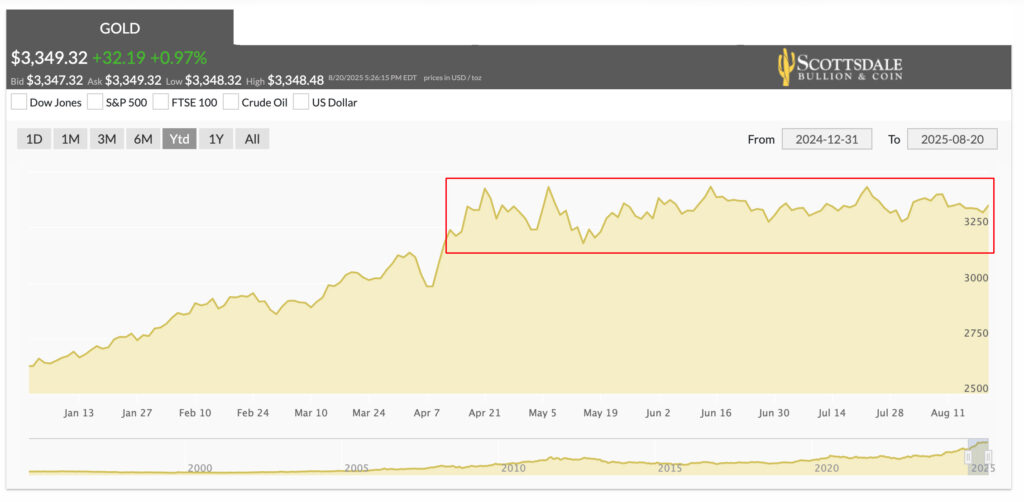 Following a steady upward trend in 2024, gold has charted a more erratic path, yet managed to surpass last year’s impressive gains of 25%. Within the first four months of 2025, gold surged by more than 33%, reaching a new peak of $3,500/oz by late April. Since then, however, prices have entered a high-level consolidation pattern.