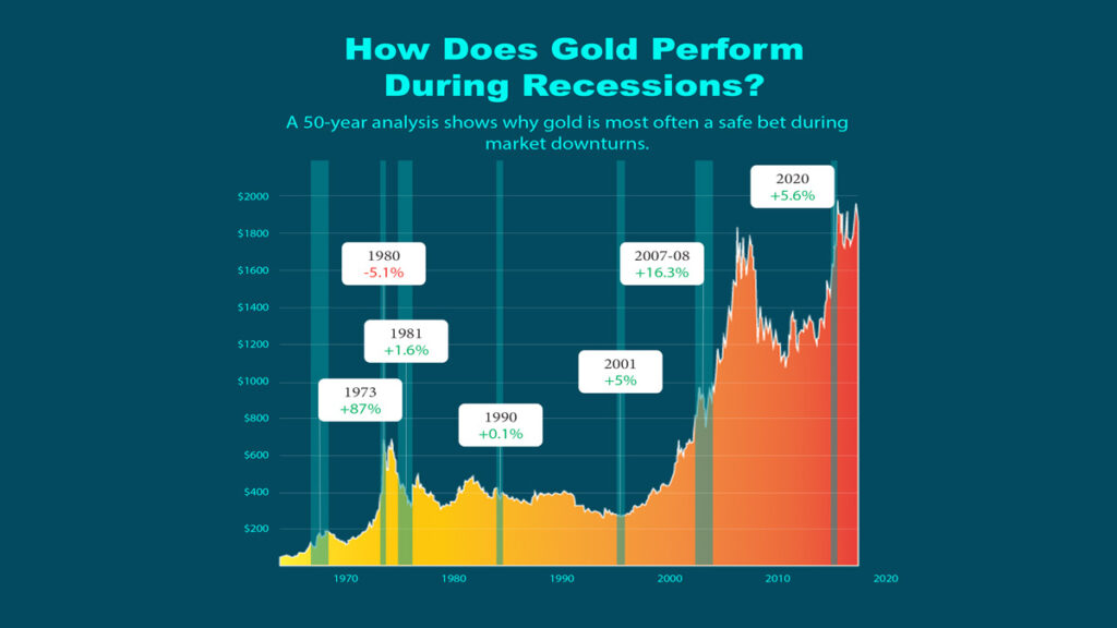A 50-year chart analysis showing why gold is most often a safe bet during market downturns.